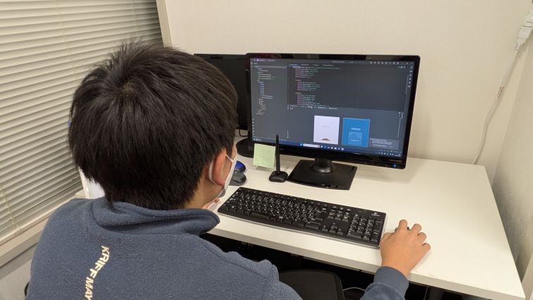 土曜日の授業終了後も、時間を忘れてプログラミングに集中する彼、最近はandroidでアプリ開発ができる「Kotlin」というプログラミング言語も学習中です♪