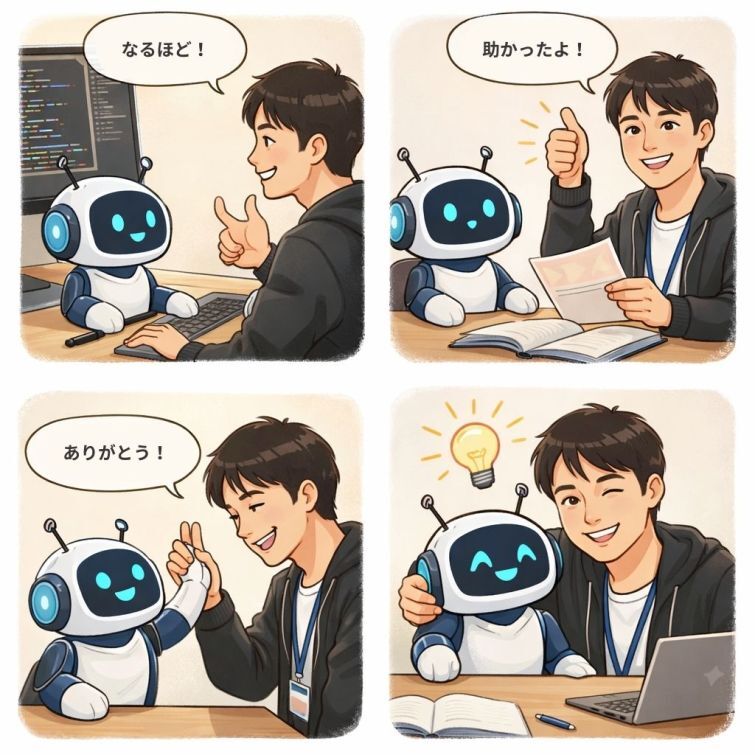 この記事にはchatGPTが作成した、「ゆめと」と「AI」が一緒に考え、学ぶ様子を描いたイラストを使っています。
