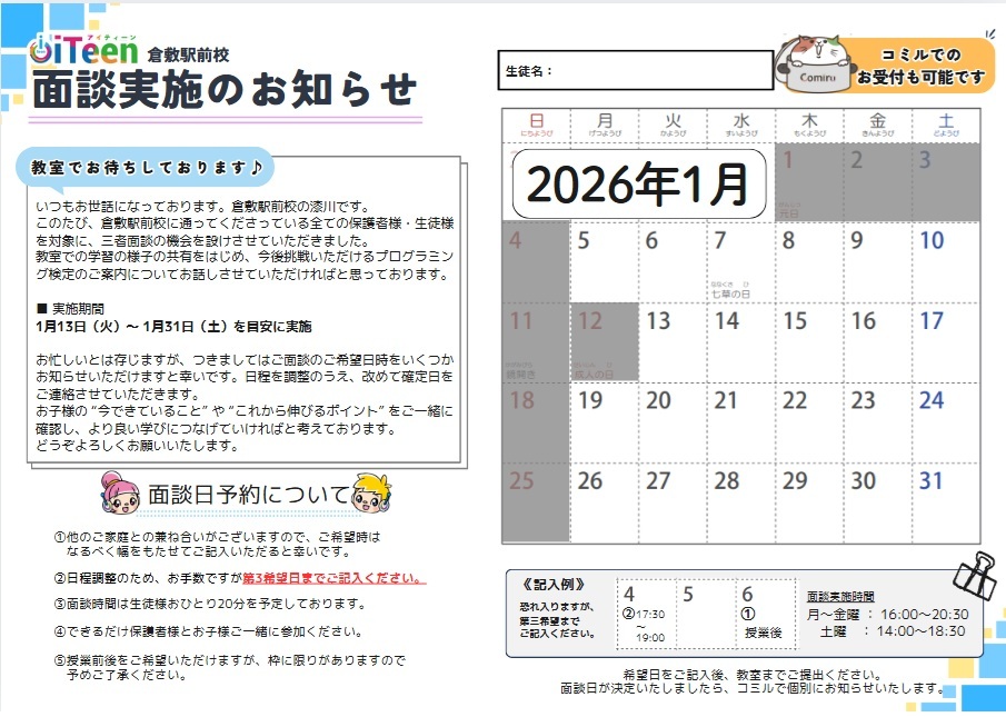 コミルか直接教室(086-427-2161)に連絡ください。